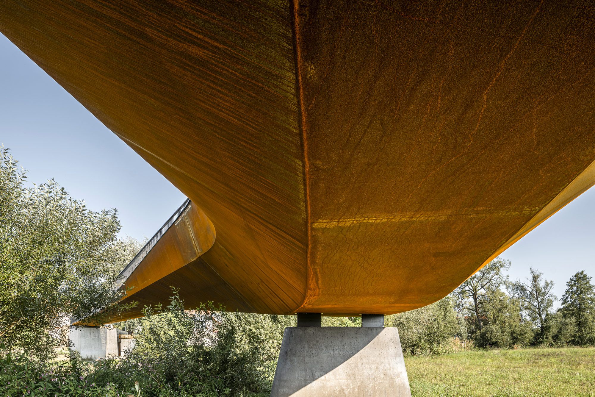 Von der Seite zeigt die Brücke ihre klassische Eleganz — die horizontale Form mit ausgeprägter Voute, die Spiegelung im Wasser, die Stille der Flusslandschaft. Aber erst von unten, mit der Kamera nah am Wasser und dem Träger schräg über dem Kopf, entfaltet sich die eigentliche Kraft dieser Konstruktion. Der Querschnitt des Hohlkastenträgers, festgehalten im frühen Morgenlicht mit Nebel noch über dem Wasser, wird zur Skulptur. Die geschwungene Unterkante läuft spitz zu wie der Kiel eines Schiffes. Dahinter führt der zweite Brückenarm ruhig in die Landschaft. Diese Perspektive zeigt nicht das Bauwerk. Sie zeigt die Entscheidung, die hinter ihm steckt. Die db (deutsche Bauzeitung) adelte die Aufnahme mit dem Titel der Ausgabe „Ingenieurbaukunst“ und veröffentlichte im April 2025 einen umfangreichen Artikel.