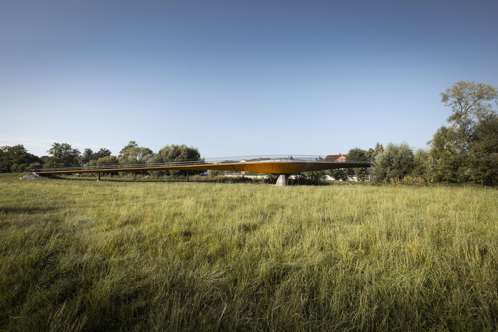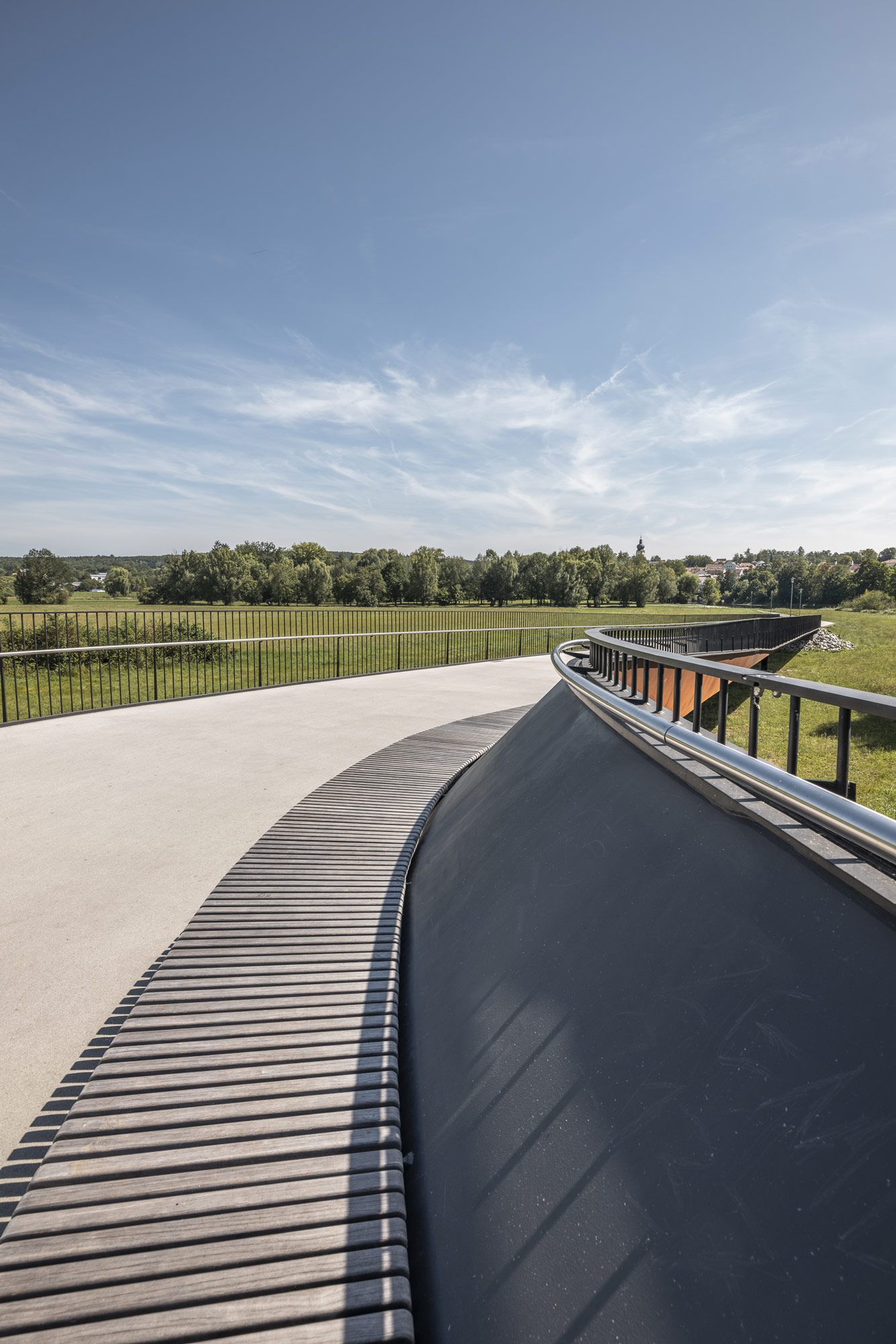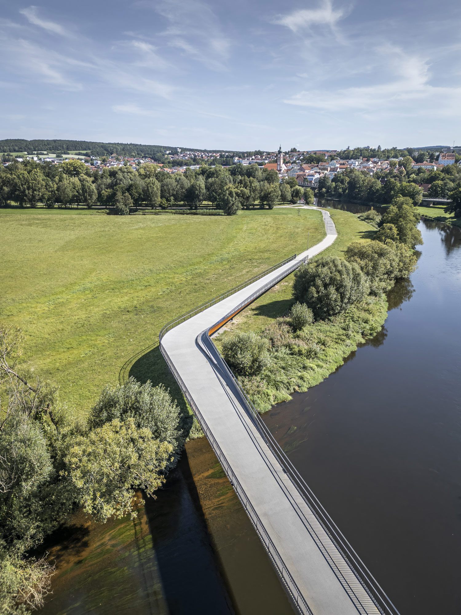 Die Regenbrücke in Roding verlangt keine Aufmerksamkeit. Kein Pylon, kein Bogen, keine Geste, die sich in den Vordergrund drängt. Sie liegt still über dem Fluss — eine horizontale Linie, die den Blick erst dann einfängt, wenn man beginnt, sie wirklich zu lesen.