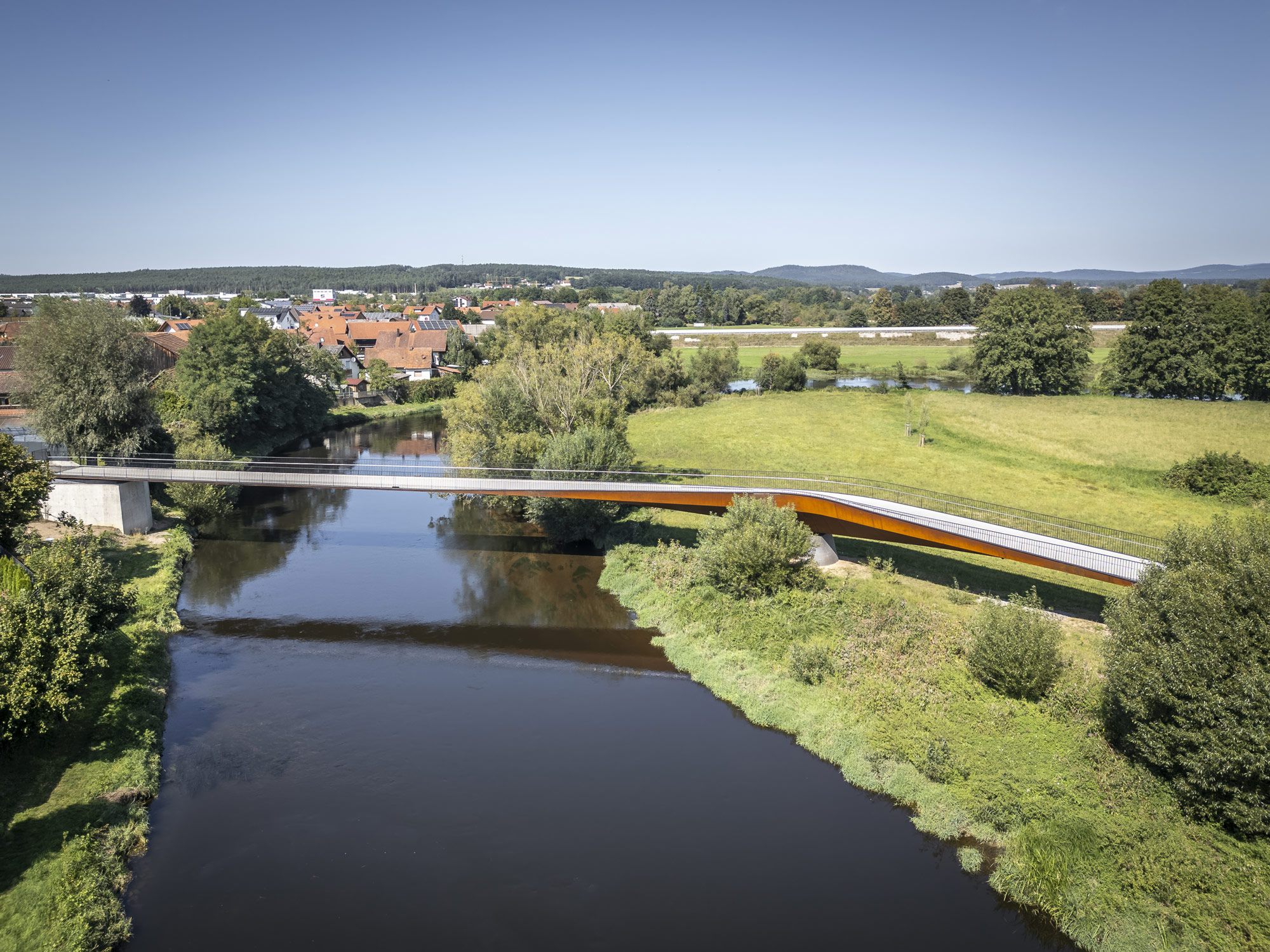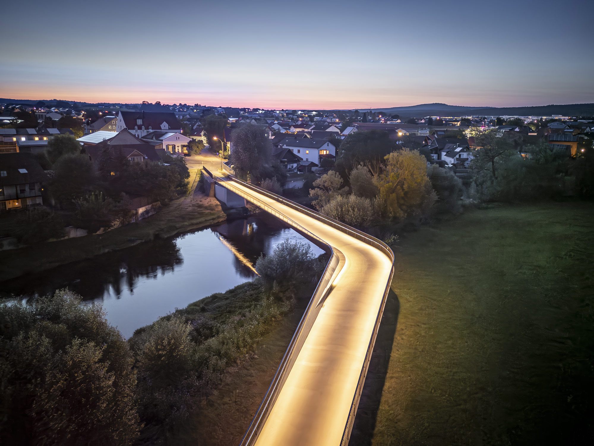Ein Bauwerk wie dieses lässt sich ohne Drohne nicht vollständig erfassen. Erst aus der Vogelperspektive erschließt sich, was vom Boden aus nur zu erahnen ist: Die Brücke ist keine gerade Linie. Sie hat eine leichte, fast beiläufige Kurve — einen Schwung, der sich in die Auenlandschaft des Regentals einschreibt und Fluss, Ufer und Ortschaft miteinander verbindet. Da Teile des Regens unter Naturschutz stehen, war für die Luftaufnahmen ein Genehmigungsverfahren erforderlich. Die Beantragung der behördlichen Freigaben wurde vollständig übernommen — damit das Projekt fotografisch so dokumentiert werden konnte, wie es das verdient.