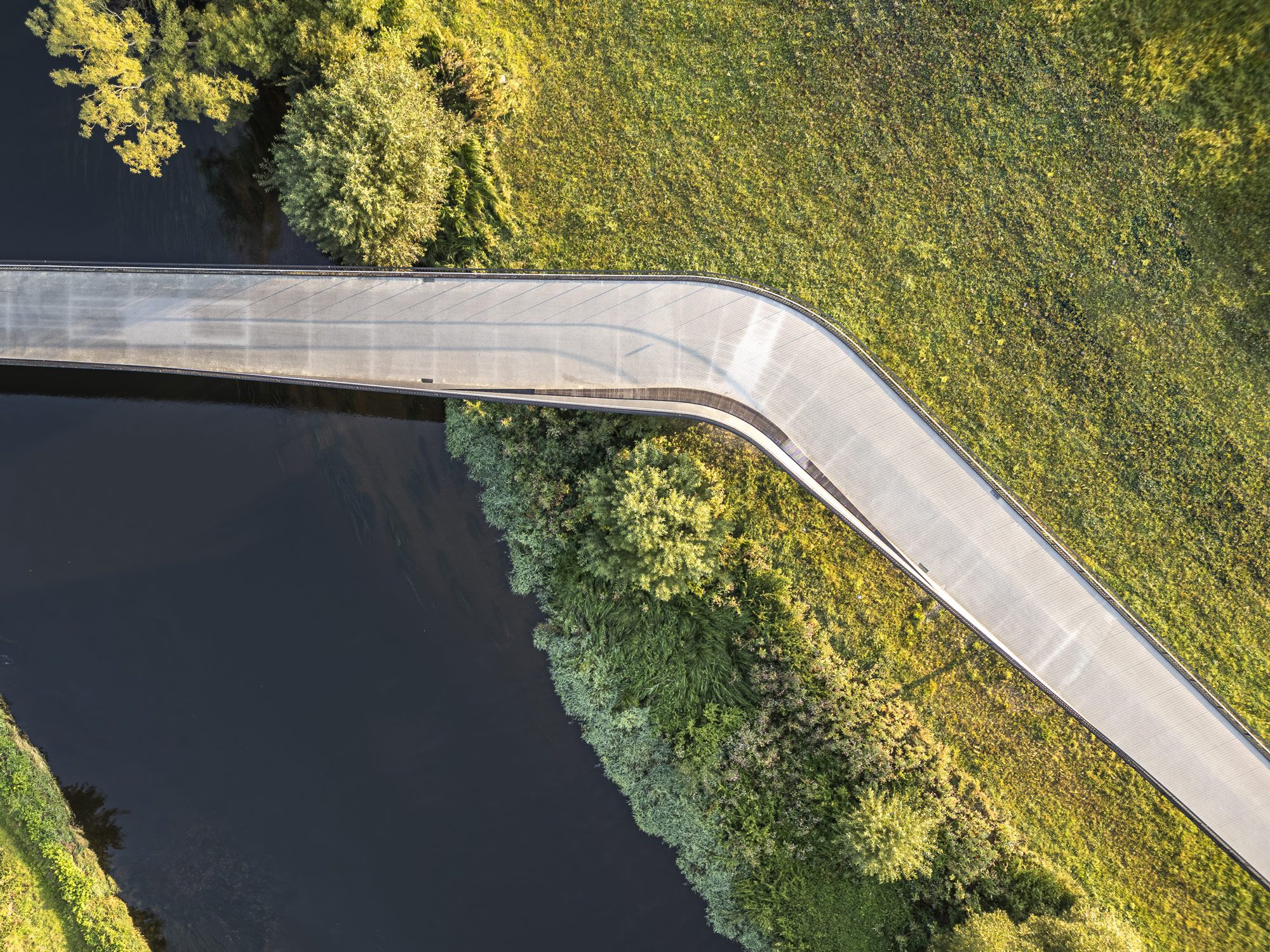 Senkrecht von oben, aus geringer Höhe: zwei Menschen auf dem geschwungenen Brückensteg, ihre Schatten lang und schmal im Sonnenlicht. Die Kurve des Weges, die Gitterroste des Geländers, das Grün der Böschung. Ein Bild, das ohne Worte erklärt, warum dieses Bauwerk existiert.