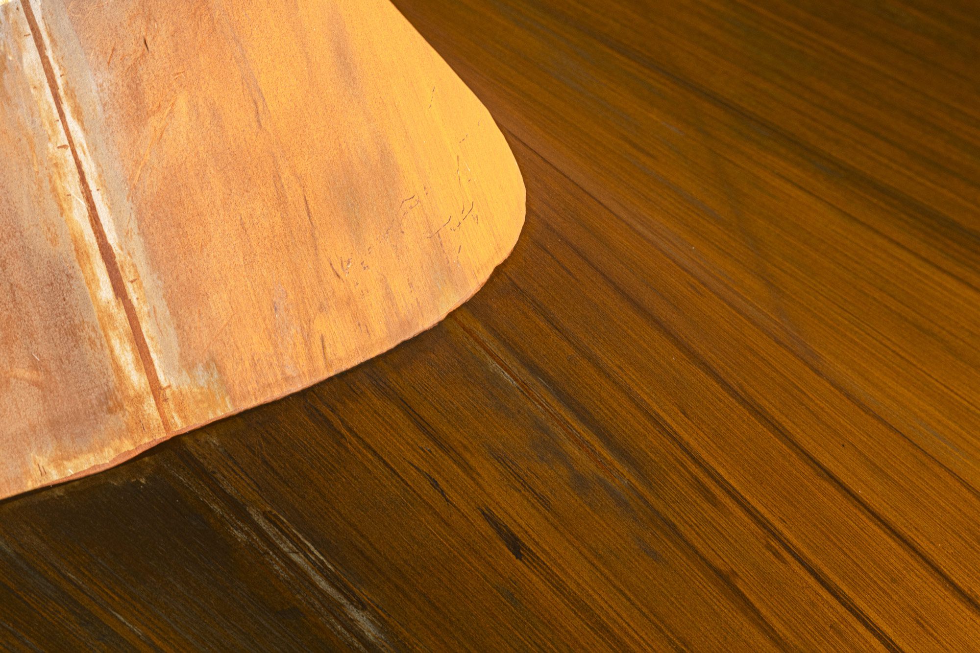 Dicht unter dem Träger, den Fokus des Shift-Objektivs nach oben korrigiert: die Oberfläche des Cortenstahls in voller Textur. Die Laufspuren der Oxidation, die Farbverläufe von Dunkelbraun über Orange bis ins fast