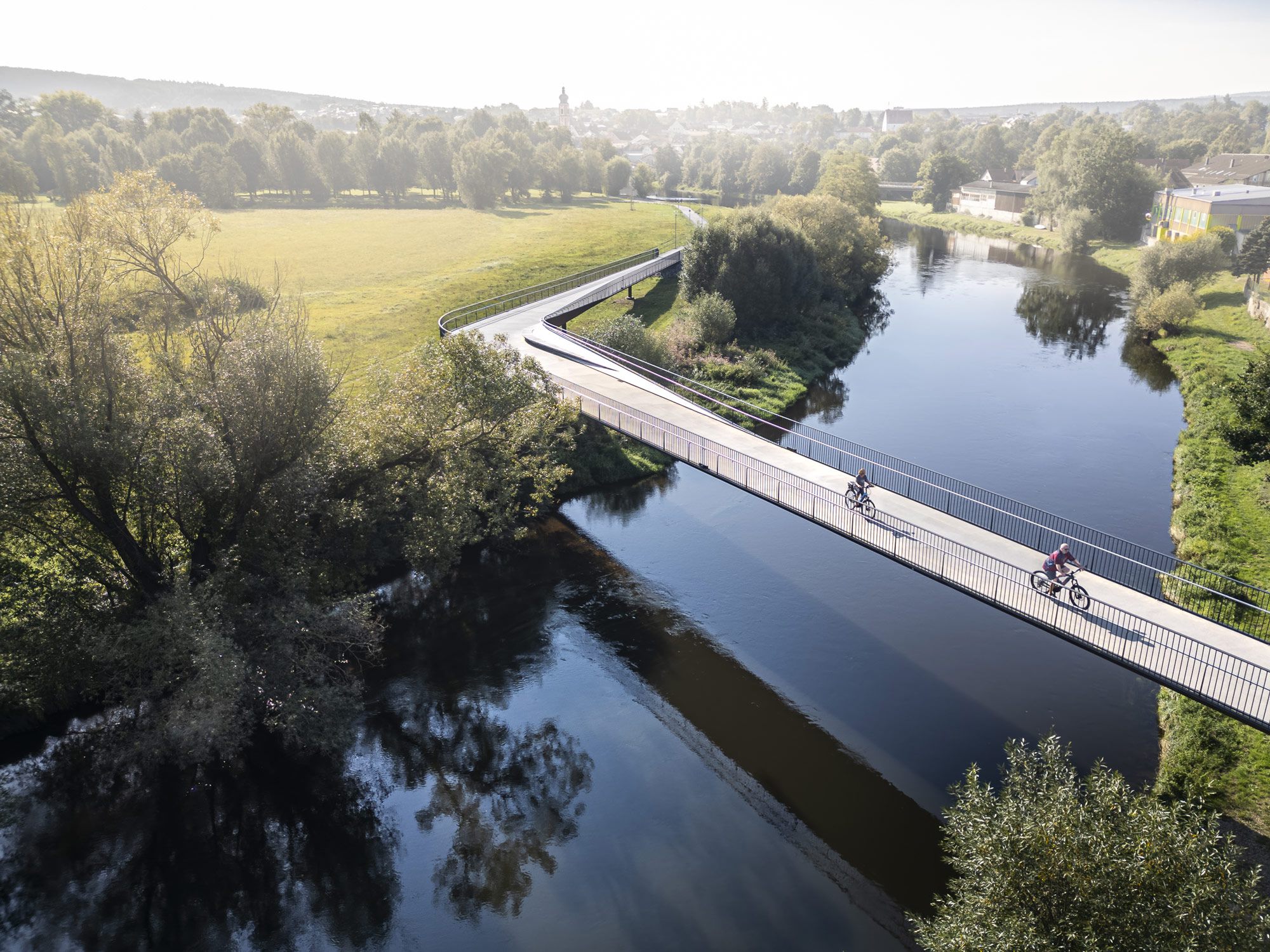 Ein Bauwerk wie dieses lässt sich ohne Drohne nicht vollständig erfassen. Erst aus der Vogelperspektive erschließt sich, was vom Boden aus nur zu erahnen ist: Die Brücke ist keine gerade Linie. Sie hat eine leichte, fast beiläufige Kurve — einen Schwung, der sich in die Auenlandschaft des Regentals einschreibt und Fluss, Ufer und Ortschaft miteinander verbindet. Da Teile des Regens unter Naturschutz stehen, war für die Luftaufnahmen ein Genehmigungsverfahren erforderlich. Die Beantragung der behördlichen Freigaben wurde vollständig übernommen — damit das Projekt fotografisch so dokumentiert werden konnte, wie es das verdient.