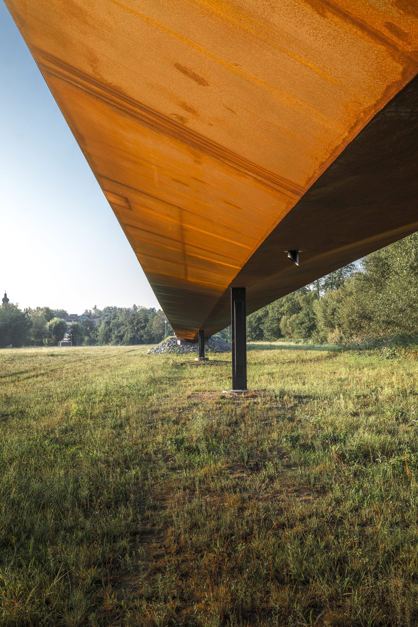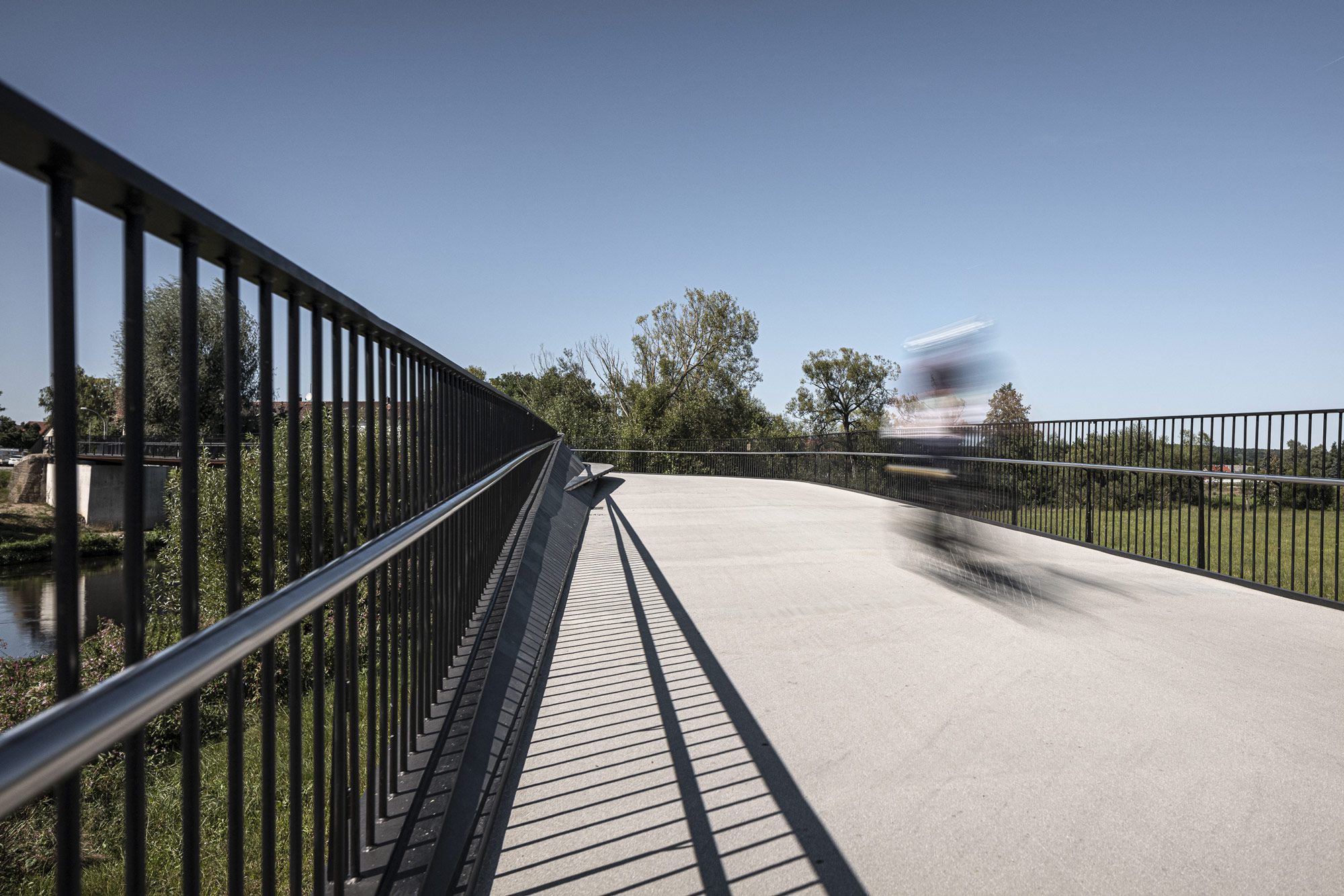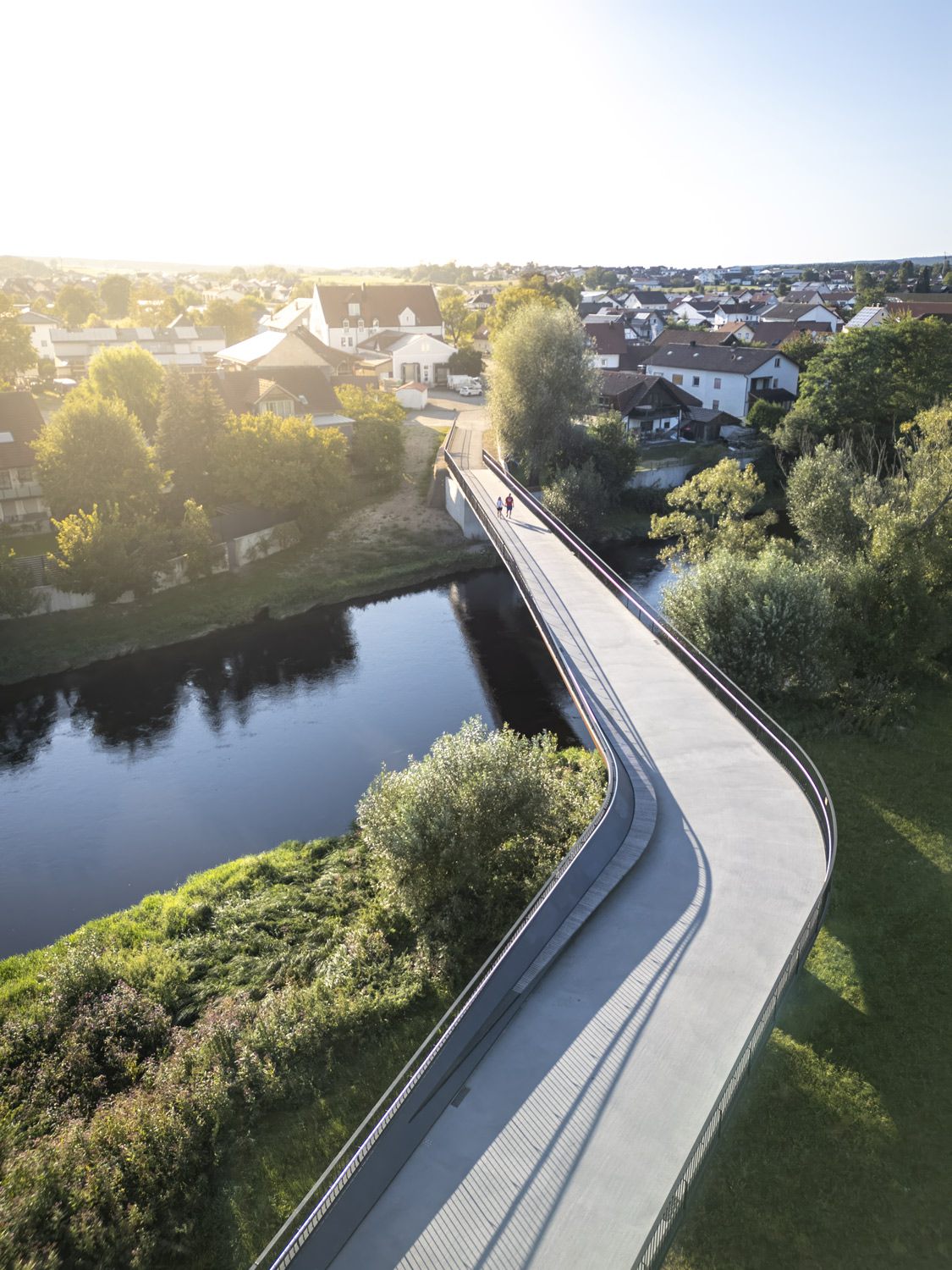 Die Regenbrücke in Roding verlangt keine Aufmerksamkeit. Kein Pylon, kein Bogen, keine Geste, die sich in den Vordergrund drängt. Sie liegt still über dem Fluss — eine horizontale Linie, die den Blick erst dann einfängt, wenn man beginnt, sie wirklich zu lesen.