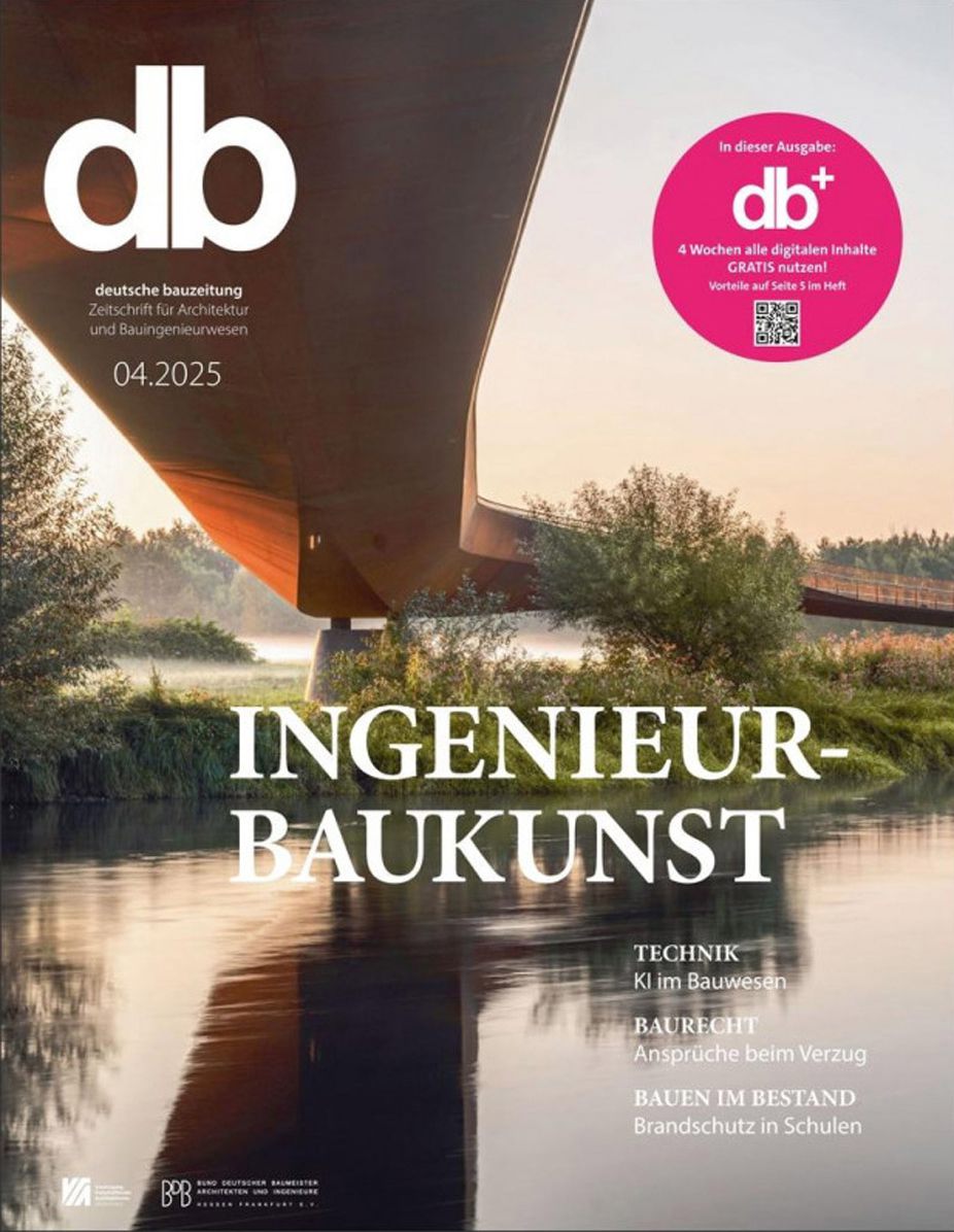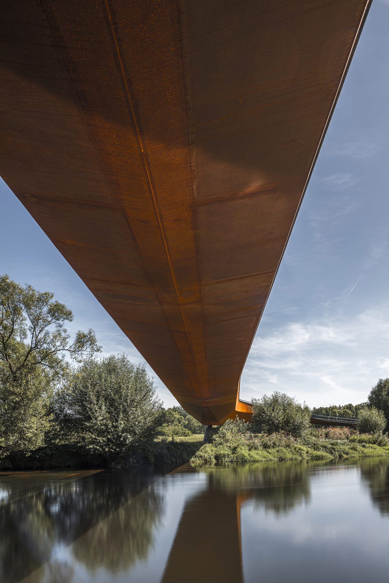 Von der Seite zeigt die Brücke ihre klassische Eleganz — die horizontale Form mit ausgeprägter Voute, die Spiegelung im Wasser, die Stille der Flusslandschaft. Aber erst von unten, mit der Kamera nah am Wasser und dem Träger schräg über dem Kopf, entfaltet sich die eigentliche Kraft dieser Konstruktion. Der Querschnitt des Hohlkastenträgers, festgehalten im frühen Morgenlicht mit Nebel noch über dem Wasser, wird zur Skulptur. Die geschwungene Unterkante läuft spitz zu wie der Kiel eines Schiffes. Dahinter führt der zweite Brückenarm ruhig in die Landschaft. Diese Perspektive zeigt nicht das Bauwerk. Sie zeigt die Entscheidung, die hinter ihm steckt. Die db (deutsche Bauzeitung) adelte die Aufnahme mit dem Titel der Ausgabe „Ingenieurbaukunst“ und veröffentlichte im April 2025 einen umfangreichen Artikel.