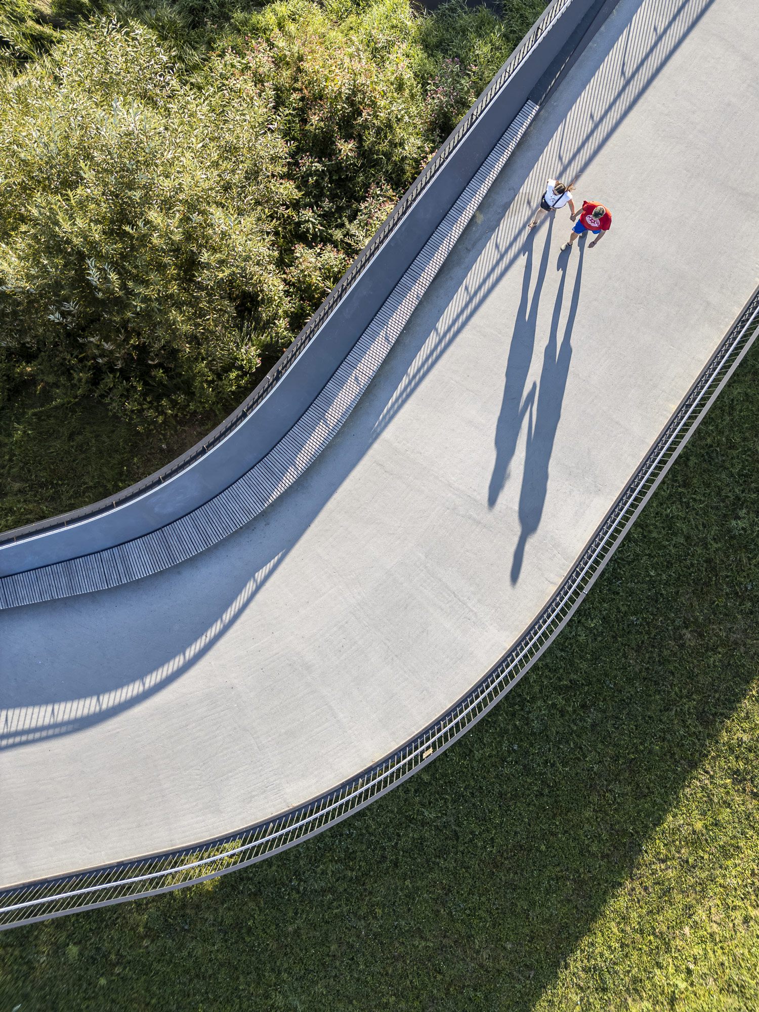 Senkrecht von oben, aus geringer Höhe: zwei Menschen auf dem geschwungenen Brückensteg, ihre Schatten lang und schmal im Sonnenlicht. Die Kurve des Weges, die Gitterroste des Geländers, das Grün der Böschung. Ein Bild, das ohne Worte erklärt, warum dieses Bauwerk existiert.